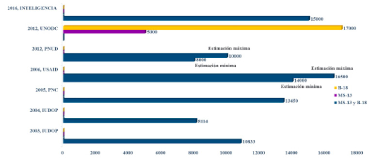 En el mes de marzo de 2005, la PNC conjeturaba la cantidad de 13, 450 dieciocheros y mareros (Reyes Calderón, 2012, p. 249). Para el mes de abril del siguiente año, el número oscilaba entre 14, 00018 y 165, 000 de acuerdo al Bureau for Latin American and Caribbean Affairs (USAID, 2006, p.64). La repetición de esta última estimación, se ha dado de forma recurrente en el tiempo y en diversos documentos a nivel nacional e internacional19.