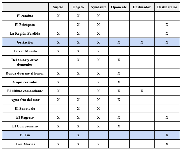 Mención aparte merece la frecuencia de las funciones del modelo actancial dentro de los ejemplos específicos de análisis. Aquí se confirma que la mayoría de los casos incluyen a la mujer en funciones de sujeto, objeto y/o ayudante; pero, también, podemos observar como algunos textos incluyen mayor o menor cantidad de estos roles dentro de su formulación narrativa (ver tabla en Figura 8). Los dos ejemplos más visibles son “Gestación”, que presenta a la mujer en todas las seis funciones actanciales; mientras que “El Fin” lo hace solamente en dos (como objeto y como destinatario). Aunque es claro que la utilización de todas las funciones actanciales no constituye una garantía, se podría argumentar que es un primer paso hacia la construcción de representaciones dramáticas más realistas y multidimensionales de género.