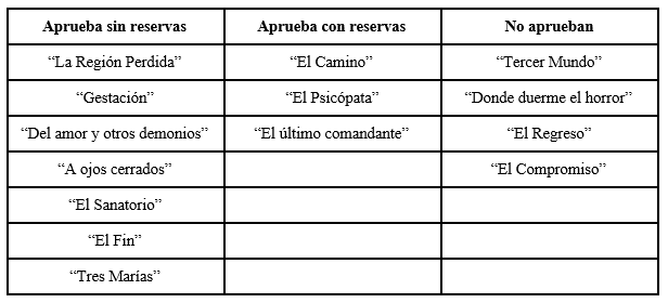 En cualquier caso, podemos observar que una mayoría de los textos (53%) aprueban sin reservas el Test de Bechdel, 20% lo aprueba con la reserva mencionada anteriormente, y un 27% no lo aprueban. No obstante, es necesario reiterar el carácter más informal y anecdótico de estos resultados, los cuales pueden no ser consistentes con los de la aplicación del modelo actancial a la hora de determinar si un film ofrece una representación dramática equilibrada entre los géneros. Por ejemplo, nótese que obras como “El Psicópata”, “El Sanatorio” y “El Fin” aprueban el Test de Bechdel, aun cuando se trata de los tres largometrajes dirigidos por hombres con protagonistas exclusivamente masculinos y sin una sola mujer en función actancial de sujeto; mientras que otras narrativas que sí cuentan con personajes femeninos protagónicos y activos (“Tercer Mundo”, “El Regreso”, “El Compromiso”) no lo aprueban.