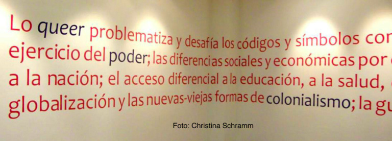 Schramm, Christina. (febrero, 2014). Foto parcial y transcripción completa de la cita “Lo queer”, Mural, Conferencia Internacional Paradigmas Queer 5, FLACSO, Quito, Ecuador, 2014.