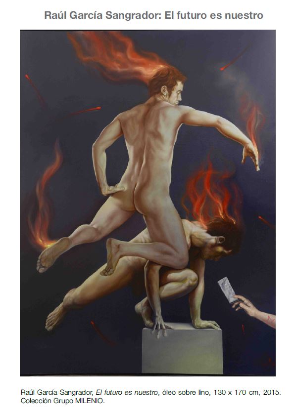 El libro de Teutle y List me pareció revelador pues, a partir de la premisa descrita por Hal Foster en “El artista como etnógrafo” (Foster, 2001), se abrió ante mí la posibilidad de desarrollar un proceso creativo fundamentado en la observación etnográfica de las prácticas de riesgo que la comunidad homosexual post sida ejerce a manera de festejo. De forma específica, El futuro es nuestro es en sí un testimonio de mi generación, profundamente afectada por la psicosis del deseo. Además del duelo, el cuadro representa el instante eterno que menciona Bajtin (1987, p. 9). En ello radica que sea una pieza de la erótica de la enfermedad en la que se intersectan placer y goce a través de la representación de corporalidades mórbidas transfiguradas por el proceso de muerte. Las figuras que ahí aparecen son, en sí, dos ausencias producidas por el sida, pero, en paralelo, son dos cuerpos más, dentro de los lugares de encuentro sexual como en los baños de vapor de Puebla, igual que en la orgía dionisíaca, en el bacanal, en donde el sudor de todos se vuelve el mismo sudor y donde los cuerpos son todos los cuerpos, y la pequeña muerte se transforma en éxtasis, en continuidad.