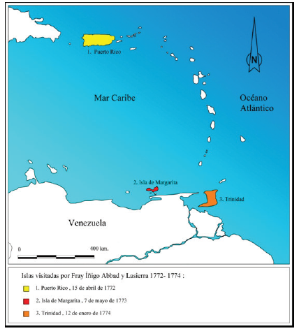 Sin embargo, no todos los espacios territoriales, ni todos los viajeros han gozado de la misma atención, nuestro caso de estudio: fray Íñigo Abbad y Lasierra es justamente uno de los viajeros que ha sido poco estudiado de manera específica, pese a ofrecer una crónica sumamente clave por su transitar por las islas de Puerto Rico, Trinidad y Margarita en la segunda mitad del siglo XVIII4 (Mapa 1). Sobre él, destacan los trabajos de Antonio Baso Andreu (1993) titulado “Andadura americana de fray Íñigo Agustín Abbad y Lasierra y algunos pasos más” y el de Sergio Martínez Sarrado (2001) “Evangelización y cultura: un enriquecimiento mutuo según Agustín Íñigo Abbad y Lasierra” ambos interesados en la figura de este hermano benedictino como una expresión de los aportes de los aragoneses a la empresa hispana en los territorios americanos.