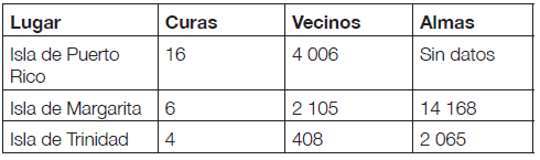 La lectura sociohistórica nos permitió acceder a la composición étnica y a la infraestructura eclesiástica de los paisajes de la región caribeña; de esta manera, podemos concluir el peso relativo de cada una de estas islas para el total de la diócesis cuyo centro tenía la isla de Puerto Rico. En esta se alojaban 16 curas mientras que en Margarita solo 6 y en Trinidad solo 4, los cuales eran además proporcionales a la población que tenían las islas para la fecha, siendo la más poblada Puerto Rico, seguida por Margarita y Trinidad. Esto también refleja los cambios en el paisaje ocurridos en los dos siglos anteriores de ocupación hispana puesto que la otrora costa de las perlas durante el temprano siglo XVI llegó a ser una de las regiones más importantes para la corona por su riqueza perlífera, y para la fecha había sido desplazada considerablemente tanto en el número de habitantes como de construcciones eclesiásticas y pueblos, puesto que en Puerto Rico visitó en más de 30 pueblos, contra los apenas seis que visitó en Margarita y nueve en la isla de Trinidad.