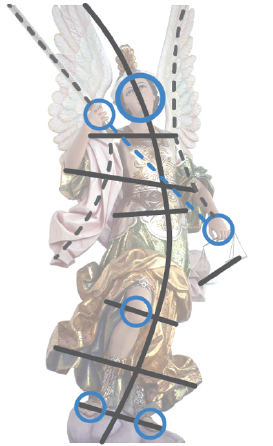 En la Figura 8 se aprecia el movimiento del arcángel en su eje principal en curva hacia la izquierda. Se observa el movimiento de cabeza y mirada hacia arriba a la izquierda, brazo derecho que levanta su espada, con significado de libertad y de fuerza, de la exterminación física, para defender las fuerzas luminosas o celestiales de las tinieblas y lo diabólico; el brazo contrario sostiene la balanza, símbolo del castigo y la culpa, a la justicia inminente. Es por eso que el arcángel Miguel posee uno de los rangos más altos, pues defiende de las fuerzas del demonio que, en otras representaciones, es aplastado con sus pies. Luego se dirige al movimiento de caderas, piernas y torso, hasta sus pies; todo posee ejes diagonales. En la nube representada, según Bachelard, simbólicamente se asocia a los mensajeros, en este caso a los ángeles y arcángeles como transmisores del anuncio de lo alto (Cirlot, 2008). Aparte del arco que forma el cuerpo, el ritmo se conjuga con el movimiento arqueado de las alas y recorrido visual a través de los puntos focales de ambas manos, rodilla derecha, los pies, la balanza contrapone el movimiento en sentido contrario y como punto principal que remata en la cabeza del arcángel. Esto provoca un fuerte cruce de movimientos, en sentido de una escultura abierta y no hierática.