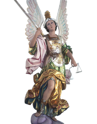 La imagen de San Miguel Arcángel traída desde Guatemala por Santos Chacón y Francisco Sánchez se convirtió en el ícono de este pueblo herediano que por sus características10 destaca el movimiento curvo de su cuerpo, piernas y brazos. Es de notar el realismo en la mirada producto de sus ojos vidriados, alas atornilladas, al igual que el ramaje de su corona, espada de madera y balanza de plata. Destaca el laminado en oro, con su claroscuro que le brinda mayor profundidad al movimiento de su traje, el tono plata de su armadura, los rosas, celestes, verdes escarlatas; asimismo sobresale una pierna desnuda, lo que brinda un movimiento dinámico de ágil elegancia entre esta y la espada que cierra con la mirada hacia lo alto, hacia la izquierda11. Cabe señalar que aunque se trata de una escultura de mediados del siglo XIX, su apariencia luce actual debido a la restauración que se le hizo en 1996.
