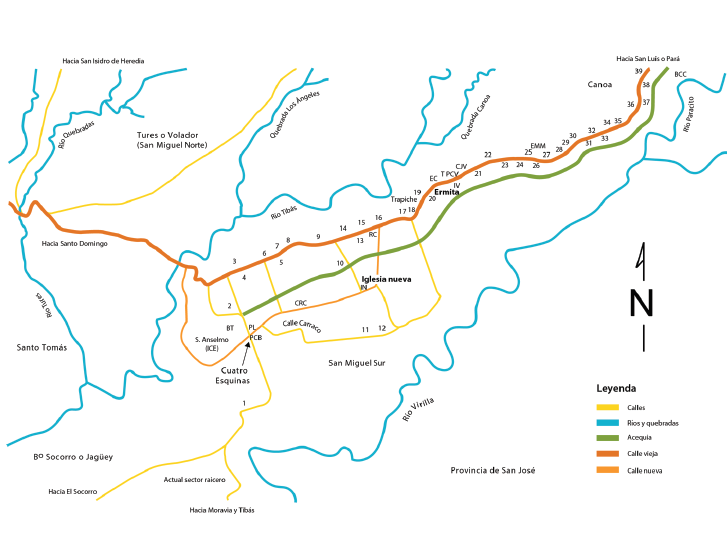 Se aclara que antes de 197114 San Miguel se componía de San Miguel Norte (actual Tures) y San Miguel Sur, la zona del Raicero, Barrio del Socorro o Jagüey y Pará. La reconstrucción del mapa detalla el nombre de calles, ríos y la acequia expuesta para anegar los cultivos, así como el sitio arqueológico San Anselmo, donde se construyó recientemente el proyecto del Nuevo Centro de Control de Energía del ICE.