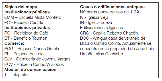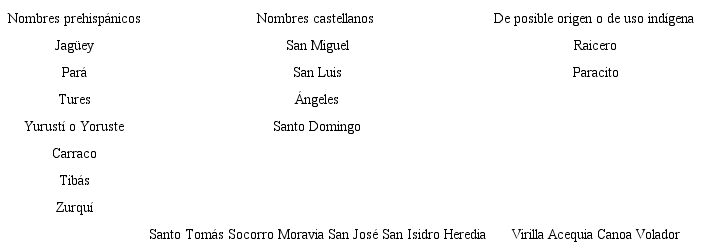De este mapa anterior se extrae un nuevo cuadro en donde se presenta nombres de origen prehispánico, nombres castellanos, con posible origen indígena o de uso indígena. Por línea puede observarse el nombre indígena de Jagüey (actual sector del Socorro en San Miguel), su nombre castellano y actual y otro posible origen indígena pero con su traducción al castellano, el Raicero, por las enormes raíces de los árboles hacia el Virilla. Pará, hoy conocido como San Luis o Lagartillal y Paracito, distrito anexo y cercano a este; similar sucede con Tures y los Ángeles, Yurustí o Yuruste y Santo Domingo, calla del carraco (pato cabeciverde o Anas platyrhynchos, Anatidade), Tibás, luego una lista de nombres castellanos y por último nombres de posible uso u origen indígena, como el Volador (por un juego con troncos giratorio en horizontal de origen prehispánico, la acequia para la conducción del agua y de uso en el cultivo desde una posible época prehispánica), canoa o canal para conducir el agua y virilla que presenta dos versiones, una precolombina, derivado de vi o bi, diablo y ri o río (Solórzano, 2014) mientras que la colonial a una dama llamada Elvirilla (de Elvira) (Bolaños, 1999).