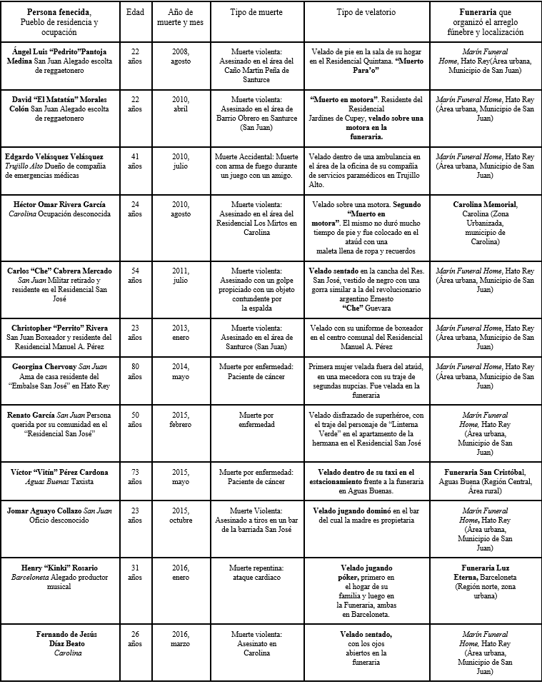 La Tabla 1 muestra que siete “velorios exóticos” fueron productos de muertes violentas, cuatro por causa de complicaciones médicas y uno accidental. En el caso de los que son productos de muertes violentas, todos han sido dentro del área metropolitana y urbana de San Juan. De estas, cinco han sido velados en residenciales públicos del área metropolitana y uno en una barriada en la ciudad de San Juan. Las edades de las personas fenecidas de maneras violentas fluctúan entre 22 y 24 años, con la excepción de un caso que tiene 54 años. El sargento Valentín, del Cuerpo de Investigaciones Criminales (CIC) de la Comandancia de San Juan de la Policía de Puerto Rico, mencionó que ninguna de las muertes violentas ha sido esclarecida por la policía. En cierta forma, la proyección mediática de estos velorios ha sido el único vehículo para recordar que estas personas sufrieron un asesinato. Quizás sea la única forma de recordar que hay crímenes en Puerto Rico en que nunca se encuentra un culpable. Además de las muertes violentas, otro tipo de fallecimiento dentro de estos “velorios exóticos” fueron complicaciones médicas. Las edades en este caso fluctuaron entre los 31 hasta los 80 años, y al igual que la muerte accidental, que era una persona de 41 años.