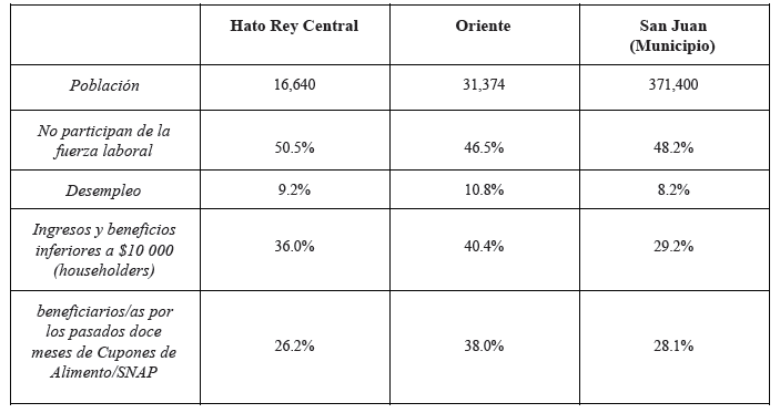 El deterioro económico junto a las violencias (individuales y colectivas) forman parte de la vida cotidiana de muchas comunidades en el margen de las ciudades caribeñas (Arroyo, 2015, p. 37). Ambos elementos destacados previamente forman parte del análisis de los “velorios exóticos”. La mitad de los velorios exóticos reseñados en la prensa se han concentrado en dos barrios de la ciudad de San Juan. Estos dos sectores urbanos de la ciudad capital reflejan una participación laboral muy baja, al igual que los ingresos monetarios por individuo para la sobrevivencia. Los barrios Hato Rey Central y Oriente son lugares económicamente deprimidos, donde las ayudas del Estado benefactor tienen una gran importancia; ahí también hay altos niveles de desempleo. Estas son condiciones sociales que no permiten una integración con las promesas del ideal capitalista, creando espacios económicamente deprimidos en el tejido urbano. Las cifras presentadas en la Tabla 2 muestran las cifras de participación laboral, desempleo, ingresos y dependencias de ayudas federales para alimentación.