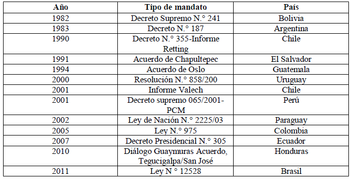 En América Latina, desde 1974, se han creado alrededor de 21 comisiones en los diferentes países, incluyendo los centroamericanos. A continuación, se presentan 13 ejemplos de comisiones con su respectivo año de creación y país (Cuadro 1).
