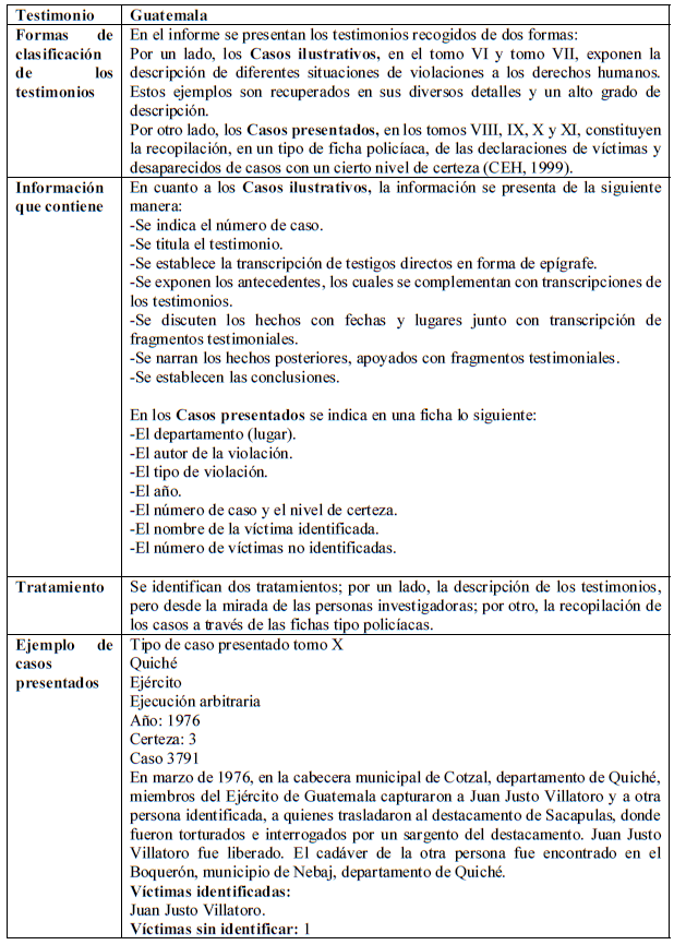 La Comisión para el Esclarecimiento Histórico recuperó aproximadamente 8 000 testimonios y calculó que “alrededor de 200.000 personas habían sido asesinadas o habían desaparecido durante el conflicto y daba pruebas de unas 658 masacres” (Sieder, 2002, p. 267). El tratamiento que se realiza en el informe de cada uno de los testimonios recolectados tiene características particulares, tal cual se presenta en el Cuadro 2.