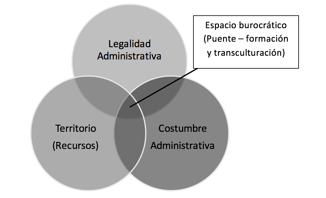 Esos funcionarios, con sus símbolos, signos y rituales asociados pretenden ser una encarnación de una modernidad mecánica, donde estos se convierten en la expresión del progreso y la educación que busca ubicar a cada persona en su lugar para el desarrollo de la civilización. Sin embargo, al mismo tiempo son una expresión perfecta de la costumbre constituida en una norma, la cual mezcla los elementos centrales de un discurso naturalista, de carácter religioso que articula las relaciones en una sociedad patrimonial, que comprende el manejo de los recursos y la articulación del poder por medio de la construcción de redes que son la expresión de esa costumbre. La burocracia es la perfecta expresión de la vinculación de ambos espacios, local y central.