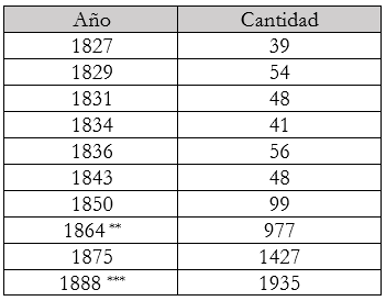 Las primeras oficinas centrales del Estado comenzaron con no más de un puñado de personas, las cuales actuaban más por patriotismo. A partir de la década de 1830 se introdujo la noción de que los funcionarios mal pagados no harían bien su trabajo, poco a poco la noción del funcionario patriota se desplazó por la del “hombre del bien” (Rodríguez, 2017b, pp. 118-131). Este actuaba como parte de un pacto social, encaminado a la búsqueda de la felicidad colectiva asociada a un progreso reflejado en las “etapas de la civilización”, que dirigía el proyecto hacia Europa como foco de esta. En el Cuadro 1 puede apreciarse la cantidad de funcionarios del Estado de Costa Rica entre 1827 y 1888.