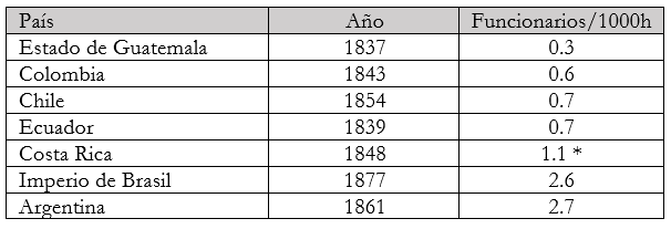 Además de lo anterior, se encuentra el tema de la “insuficiencia” de estos funcionarios, para lo cual debemos considerar tres elementos: a) la cantidad de funcionarios por habitante, b) su educación para ejercer puestos de oficina y c) su capacidad para ejercer sus tareas. Si bien no nos extenderemos sobre estos puntos, ya que no es el objetivo del artículo, resulta útil valorar rápidamente algunos elementos importantes. En primer lugar, es relevante considerar que Costa Rica pasó de tener un funcionario por cada 1 583 habitantes en 1827, a un funcionario por cada 961 habitantes en 1848 y más tarde tuvo un funcionario por cada 110 habitantes en 1888 (ver Cuadro 2)19.