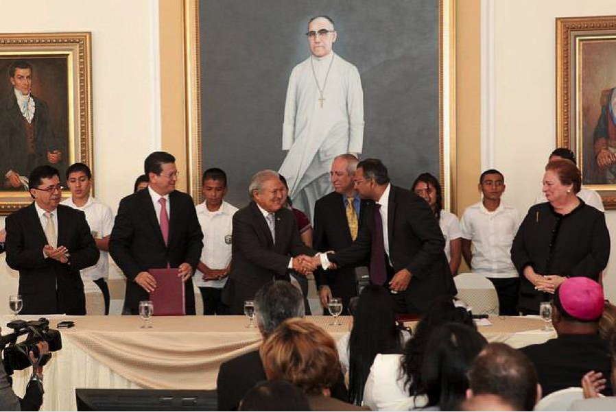 En esta foto de 2014, el presidente Sánchez Cerén y un equipo de oficiales estadounidenses anuncian un nuevo paquete de ayuda de la Millennium Challenge Corporation para El Salvador. El telón de fondo es una pintura del Monseñor Romero.