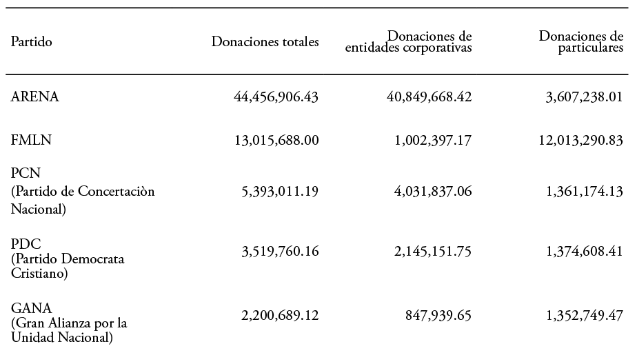 La derecha también tenía la mayoría de los recursos económicos. Las capas oligarcas salvadoreñas fueron libres para inundar los cofres de campaña de ARENA. ARENA, por lo general, recibe el triple en donaciones de campaña que el FMLN. Mientras que ARENA obtiene el 92 % de su dinero de corporaciones y otras organizaciones privadas, el FMLN obtiene el 92 % de sus donaciones de individuos. Cuando se consideran las contribuciones a partidos de derecha más pequeños, la disparidad es aún más impresionante (Tabla 1). La publicidad de campaña difiere en consecuencia, ya que ARENA gastó dos tercios del total en el ciclo electoral de 2009 (Rodríguez, 2013). Incluso esa estadística subestima la desigualdad en el acceso a la publicidad, ya que los intereses de las empresas privadas que apoyan a la derecha son los dueños de la mayoría de los medios de comunicación del país y producen un volumen constante de cobertura favorable para la derecha mientras se difama a la izquierda (Wolf, 2009, pp. 440-442).