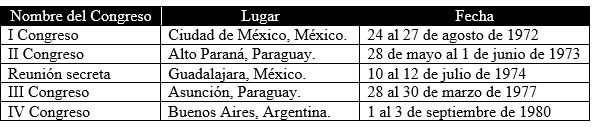 Los siguientes congresos se realizaron con un alto carácter de secretismo. El segundo Congreso organizado por la CAL se realizó en el Salón de Conferencias de la Delegación de Gobierno del Alto Paraná, Paraguay, del 28 de mayo al 1 de junio de 1973; una tercera reunión se realizó en Guadalajara, México, del 10 al 12 de julio de 1974 (Archivo General de la Nación, 5 de julio de 1974); oficialmente, el III Congreso se realizó en Asunción, Paraguay del 28 al 30 de marzo de 1977 (Ver Tabla 2).