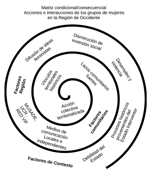 La existencia de este proceso social básico que documenta la acción organizada de mujeres en espacios comunitarios no puede ser explicada sin la intervención de un análisis que ponga en cuestión y en perspectiva distintos factores explicativos para la densidad de este tejido social en la Región de Occidente. Para ello se recurrió a la construcción de lo que se conoce en Teoría Fundamentada como “matriz condicional/consecuencial”.