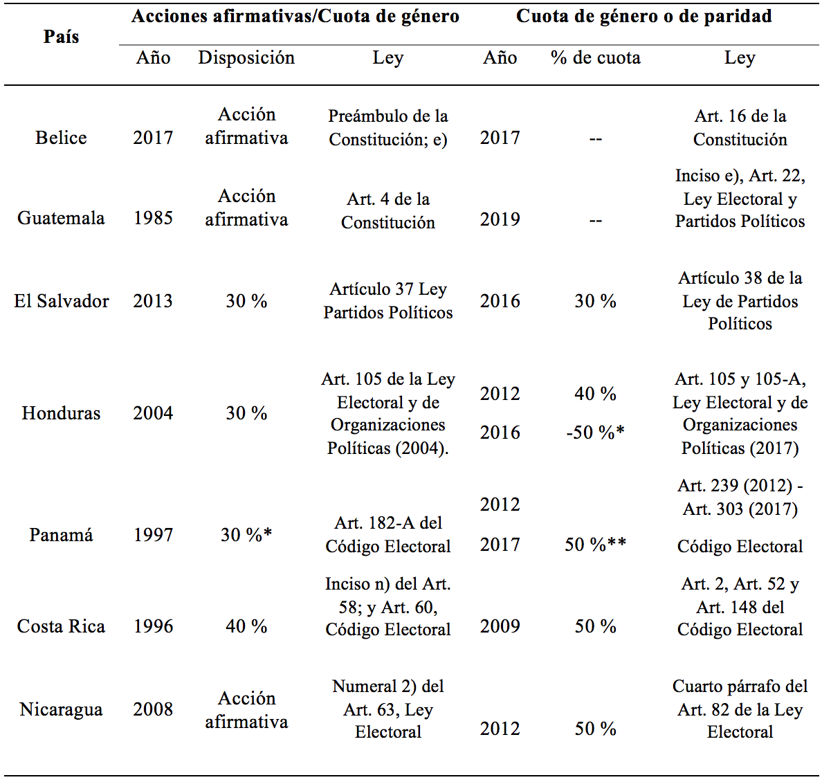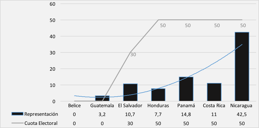 Las cuotas electorales de género en Centroamérica han tenido un proceso gradual de implementación, que inició con el reconocimiento constitucional de acciones afirmativas, hasta incluir, en las leyes electorales o de partidos políticos, espacios reservados para mujeres. Costa Rica inició en 1996 con el 40 % para pasar al 50 % en 2009; Panamá comenzó en 1997 con el 30 %, para alcanzar la proporción de paridad en 2012, actualizada en 2017; Honduras inició el camino en 2004 con el 30 %, pasó al 40 % en 2012 y llegó al 50 % en 2016; El Salvador insertó en la ley de partidos políticos el 30 % de espacios para mujeres en 2013 y agregó algunas especificaciones en 2016; y en Nicaragua, en 2012 se establece la cuota de 50 % para hombres y mujeres, según se observa en la Tabla 1. De tal forma que, en dos países no hay cuotas de género (Belice y Guatemala), en uno es 30 % (El Salvador), y en cuatro es del 50 %, Honduras, Panamá, Costa Rica y Nicaragua.