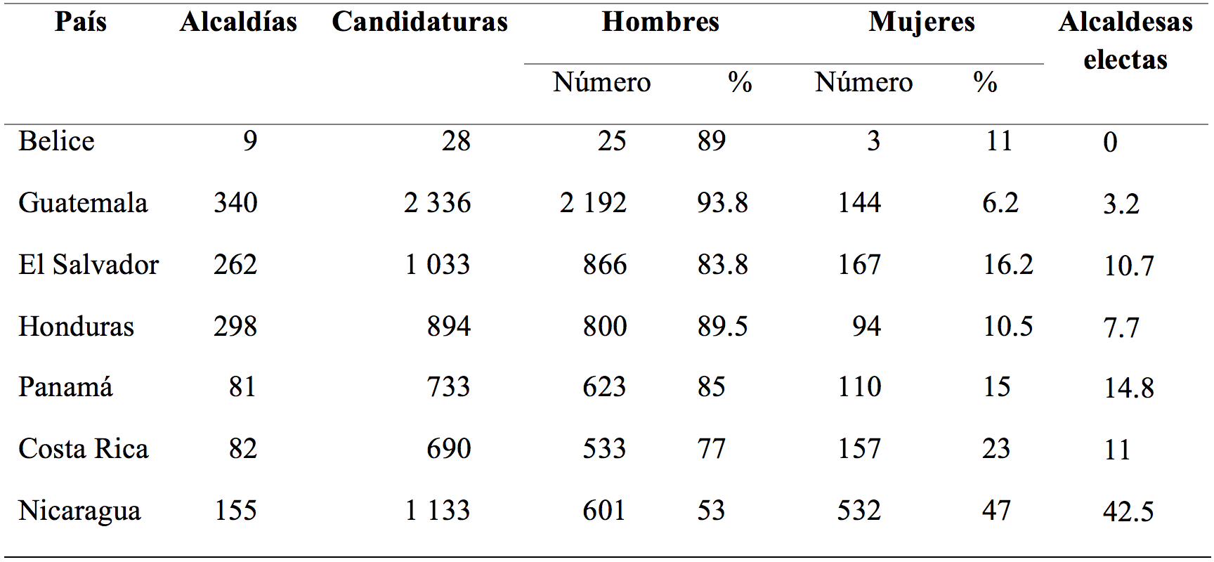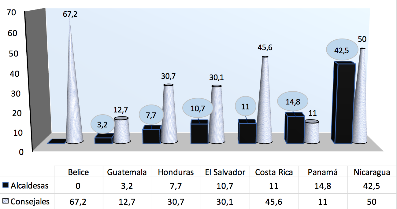 Los consejos municipales, en Centroamérica, se integran por un alcalde o alcaldesa, un(a) vicealcalde(sa) o síndicos(as) y un número variable de concejales(as) o regidores(as); se renuevan cada tres años en Belice, Guatemala, El Salvador y Nicaragua, cada cuatro en Honduras y Costa Rica y cada cinco en Panamá. El número de municipios (distritos o cantones) es de nueve en Belice, 81 en Panamá, 82 en Costa Rica, 153 en Nicaragua, 262 en el Salvador, 298 en Honduras y 340 en Guatemala. Las elecciones municipales en la región se realizaron en 2017 en Honduras y Nicaragua, en 2018 en Belice y El Salvador, en 2019 en Guatemala y Panamá y en 2020 en Costa Rica. Los resultados electorales, en el periodo analizado, nos indican que ninguna mujer fue electa en Belice, en Guatemala lo fueron 11 (3.2 %), 23 en Honduras (7.7 %), 28 en El Salvador (10.7 %), nueve en Costa Rica (11 %), 12 en Panamá (14.8 %) y 65 en Nicaragua (42.5 %).