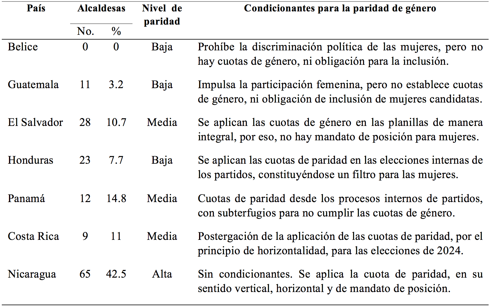 En materia de cuotas electorales, se destacan tres resquicios normativos en las leyes electorales y de partidos políticos en Centroamérica, para logar la paridad de género en el cargo de alcaldesa: 1) en la composición de las planillas municipales, se aplica la cuota de género de manera integral, que permite que los partidos políticos incluyan a las mujeres, en número total, como candidatas a alcaldesa, vicealcaldes(as) o concejales(as), y como propietarias y suplentes; 2) se aplica la cuota de género, primero, en los procesos internos de los partidos políticos, limitando la posibilidad de que las mujeres sean postuladas como alcaldesas en la lista final de candidaturas; y 3) no se respeta el mandato de posición y la paridad horizontal, imposibilitando la postulación de mujeres para el cargo principal, delegándolas en un segundo o tercer orden, en las planillas.