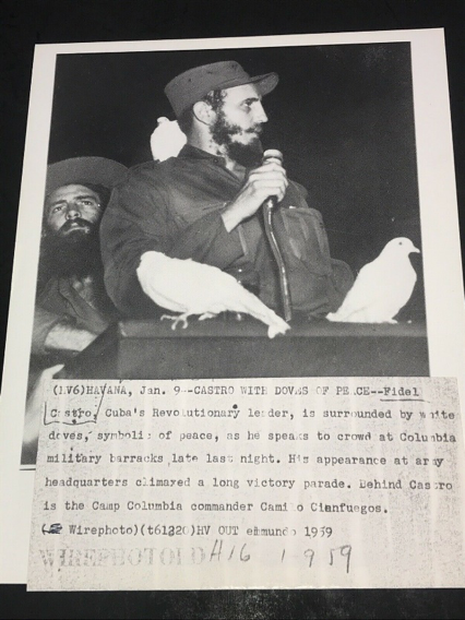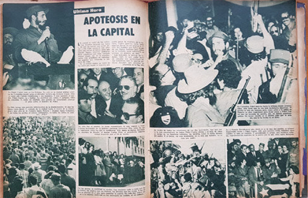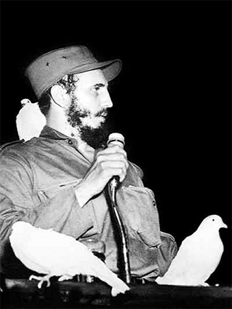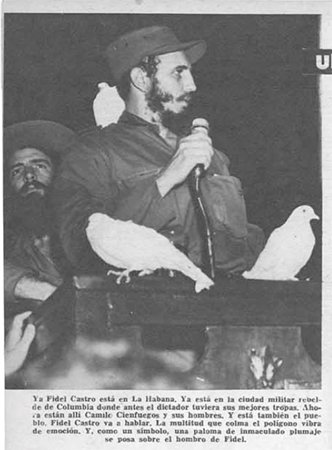 Ya Fidel Castro está en La Habana. Ya está en la ciudad militar rebelde de Columbia donde antes el dictador tuviera sus mejores tropas. Ahora están allí Camilo Cienfuegos y sus hombres. Y está también el pueblo. Fidel Castro va a hablar. La multitud que colma el polígono vibra de emoción. Y, como un símbolo, la paloma de inmaculado plumaje se posa sobre el hombro de Fidel (Bohemia, 1959, p. 92).