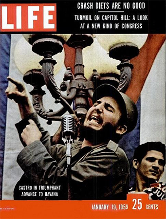 En la portada del 19 de enero de 1959, Life publicó una fotografía a color en la que Castro aparece con barba y vestimenta militar. En lo que respecta al texto actancial, encontramos el pronunciamiento de un discurso y la utilización de ademanes enfáticos al modo en que suelen expresarse los políticos y los grandes oradores para reforzar el efecto de sus palabras. La fuerza de la imagen está en el gesto de Castro. Un ciudadano con los distintivos del M-26-7 se ubica en un plano secundario, lo que le otorga centralidad a la figura de Castro, además de que engrandece su rostro que muestra emotividad y apasionamiento por el discurso que pronuncia. El micrófono, como una pieza más de su arsenal, le otorga una fuerza especial, la de un líder que se comunica por medio del altavoz con una multitud enardecida (Corona, 2014, p. 75).