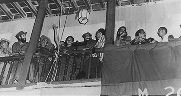 Dentro de la representación iconográfica, los uniformes vestidos por la gente que rodea a Fidel, así como el abundante armamento que aparece en la toma, forman un conjunto que revela la presencia de una agrupación castrense que ocupa la totalidad de la escena; aun cuando la posición central es dominada por Fidel Castro. Pero eso no es todo. La imagen del momento fotografiado permite ver otros detalles que destacan al mirar de manera cuidadosa a la fotografía. En especial, quiero llamar la atención en la presencia de un instrumento que a primera vista no parece fácil de observar, o detectar, debido a que el talente del orador descuella al momento de la captura. Me refiero a las cámaras fotográficas.