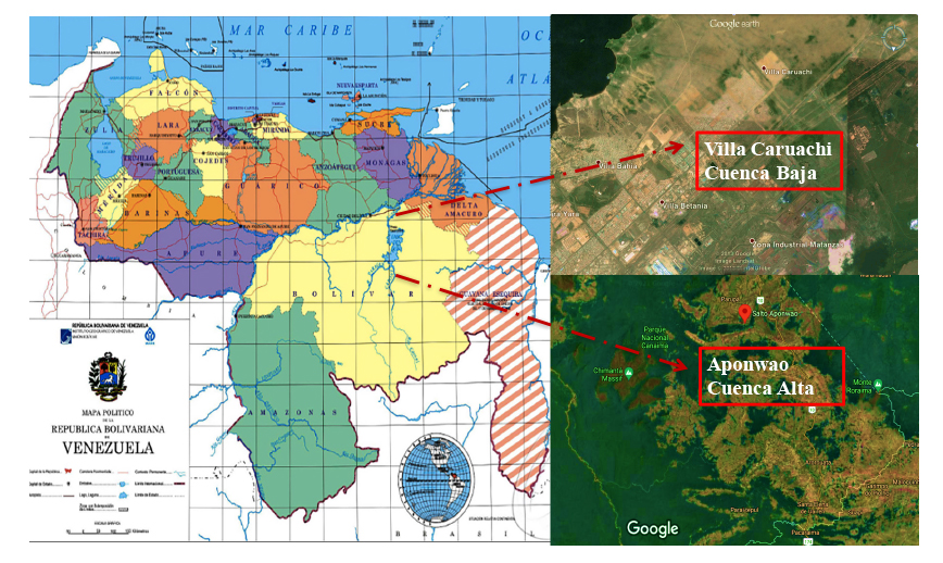 El estudio se desarrolla en el estado Bolívar ubicado al sureste del país, con una superficie de 242 801 Km². Este estado se encuentra dividido en 11 estructuras político-territoriales o de nivel municipal. Seis municipios (Caroní, Bolivariano de Angostura, Piar, Angostura del Orinoco, Sifontes y Gran Sabana) se superponen en la cuenca del río Caroní, abarcando un “área de aproximadamente 92.170 Km2, donde alrededor de 245 ríos tributarios convergen en ella” (Sánchez, Rosales y Vessuri, 2013, p. 91). El río Caroní es tributario del río Orinoco y nace en la frontera con Guyana (Silva, 2005). La cuenca se encuentra superpuesta por Áreas Bajo Régimen de Administración Especial (ABRAE), entre ellas el Parque Nacional Canaima (PNC). La cuenca presenta una topografía accidentada, produciendo rápidos, cascadas y desniveles del río Caroní con una muy baja carga de sedimentos que han permitido desarrollar un sistema de presas hidroeléctricas de gran importancia al proveer el “72% de la energía eléctrica nacional y a países vecinos como Brasil y Colombia” (Sánchez, Rosales y Vessuri, 2016, p. 65). Es relevante el hecho de que esta cuenca se ubica, según Rosales (2003, p. 11), “dentro de las más importantes del gran reservorio hídrico mundial para su conservación constituido por el Escudo Guayanés”.