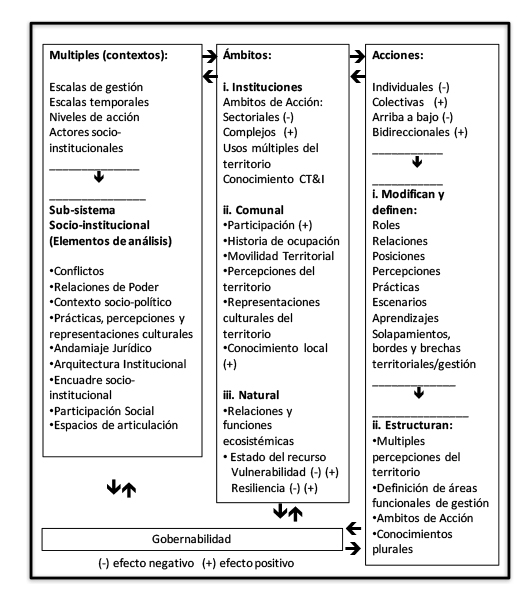 Las características múltiples, entre ellas la multiescala de gestión, los multiactores y los múltiples niveles de las acciones, inclusive los límites, bordes o brechas del mismo sistema asociados a una unidad primaria, como es la escala cuenca hidrográfica, son un hecho que se asume como una multiterritorialidad, Este fenómeno va definiendo áreas funcionales o escalas de gestión que permiten presentar un diagrama derivado de las relaciones del subsistema socioinstitucional y su incidencia en la gobernabilidad, tal y como se observa en la Figura 3.