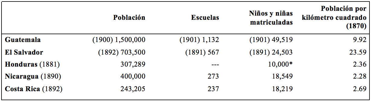 A diferencia de Costa Rica, es probable que en el resto de las repúblicas centroamericanas la población más beneficiada con la escolarización fuera la urbana o semiurbana, en detrimento de las zonas rurales, lo cual contribuyó a exacerbar las desigualdades socioeconómicas al interior de dichos países. En el caso de Guatemala, la exclusión del territorio rural afectó profundamente a los pueblos indígenas. Asimismo, cabe señalar que en el caso de El Salvador los gobernantes decidieron invertir más en las fuerzas armadas que en la educación pública primaria; por ejemplo, en el quinquenio 1897-1901 el gasto más bajo que registró la cartera de Guerra fue el de 1899, que ascendió a 1 233 780 colones, mientras que el más alto que tuvo la cartera de Instrucción Pública fue el de 1897, que consistió en 688 562 colones; en 1901 Instrucción Pública apenas recibió 316 414 colones, mientras Guerra se quedó con 1 719 852 colones del presupuesto nacional (Walter, 2014, p. 29).