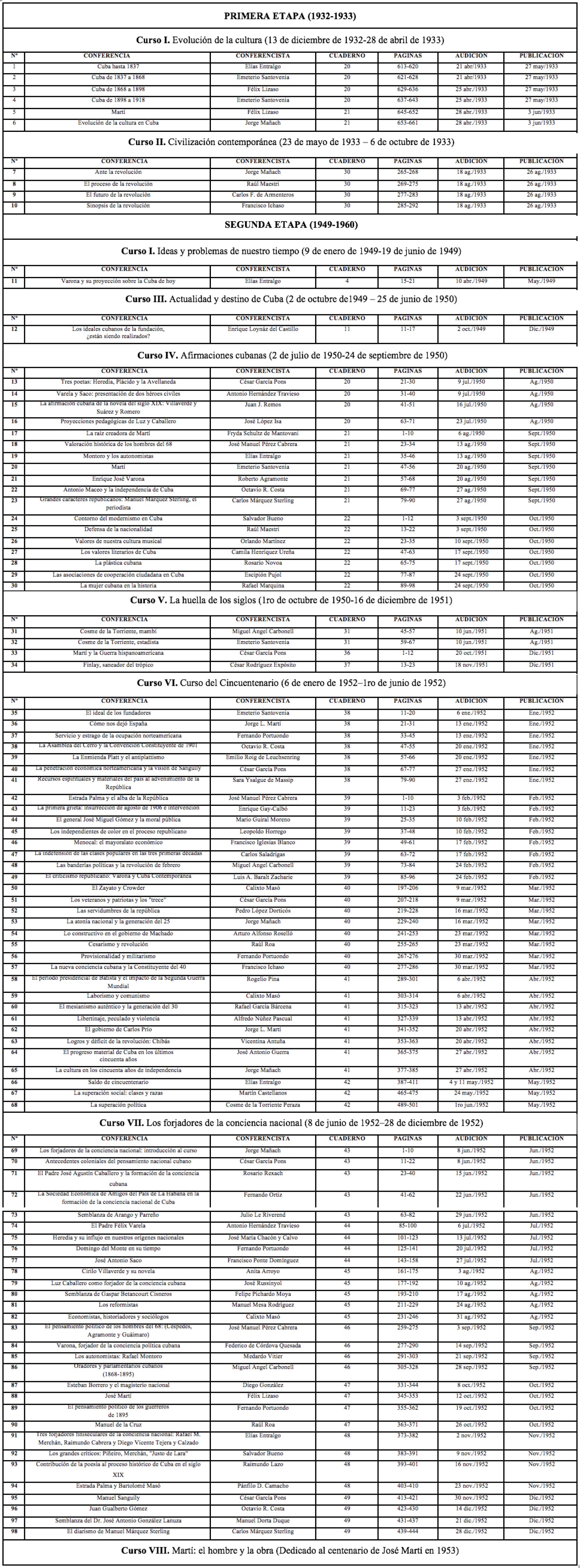 Siguiendo un criterio esencialmente temporal, las conferencias sobre historia de Cuba pueden dividirse en dos grandes grupos, las que abordan la época colonial y las que tienen como marco cronológico la etapa republicana. Los siglos posteriores a la toma de La Habana por los ingleses captaron el espesor del análisis histórico. Más de la mitad de las conferencias se dedicaron a personalidades, grupos e instituciones relevantes de la historia nacional, ponderando el examen de aquellos que por su labor política, filosófica o cultural se les consideraba forjadores de la conciencia cubana.