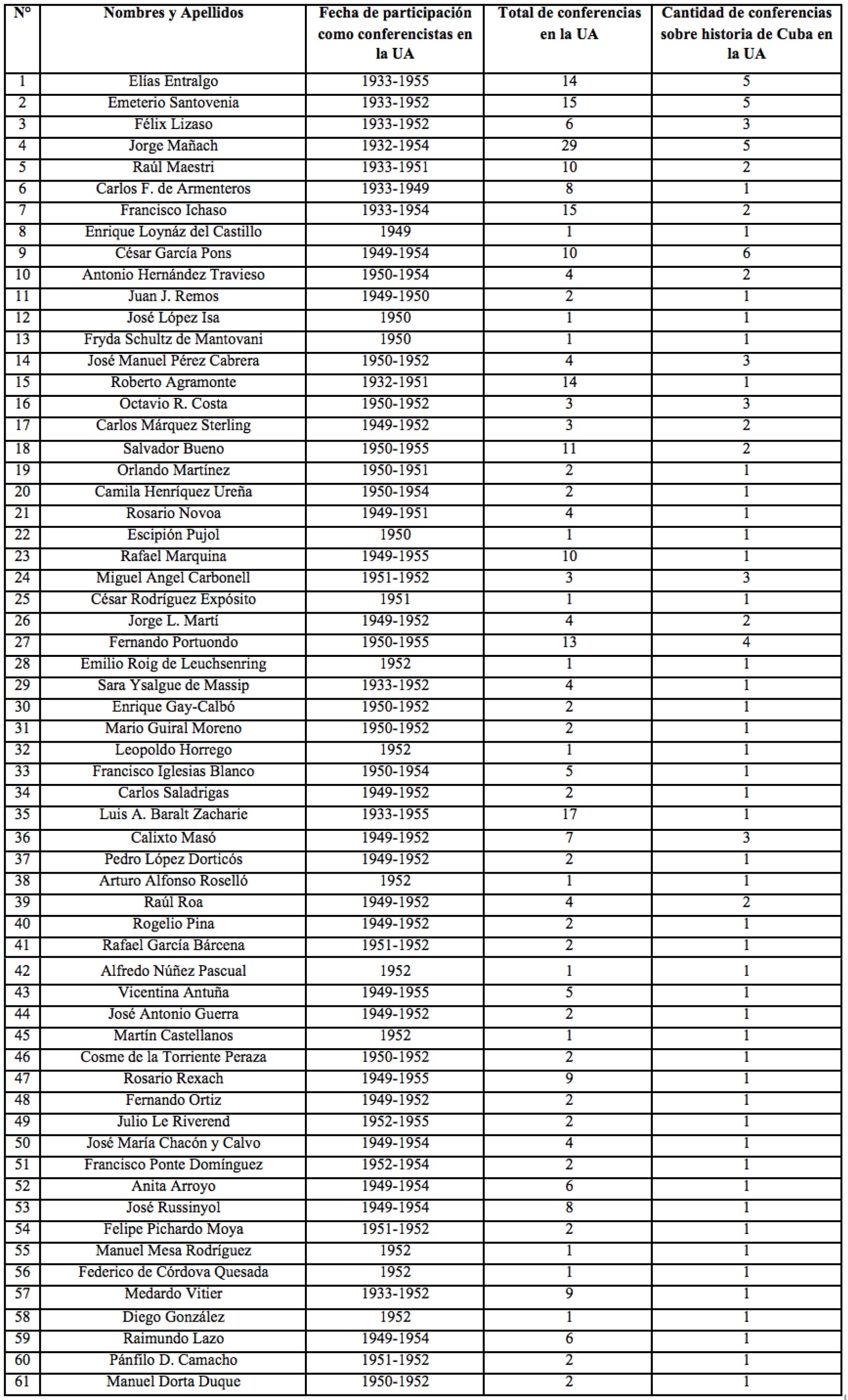 Durante los 12 años de vida de la institución desfilaron por su tribuna un total de 259 conferencistas; de ellos, 61 disertaron sobre la historia de la nación, tal como se observa en la Tabla 2, 54 eran hombres –cifra que representa aproximadamente el 89 %–, y siete eran mujeres: Camila Henríquez Ureña (1894-1973), Sara Ysalgue de Massip (1894-1989), Rosario Novoa (1905-2002), Vicentina Antuña (1909-1993), Rosario Rexach (1912-2003), Fryda Schultz de Mantovani (1912-1978) y Anita Arroyo (¿-?).