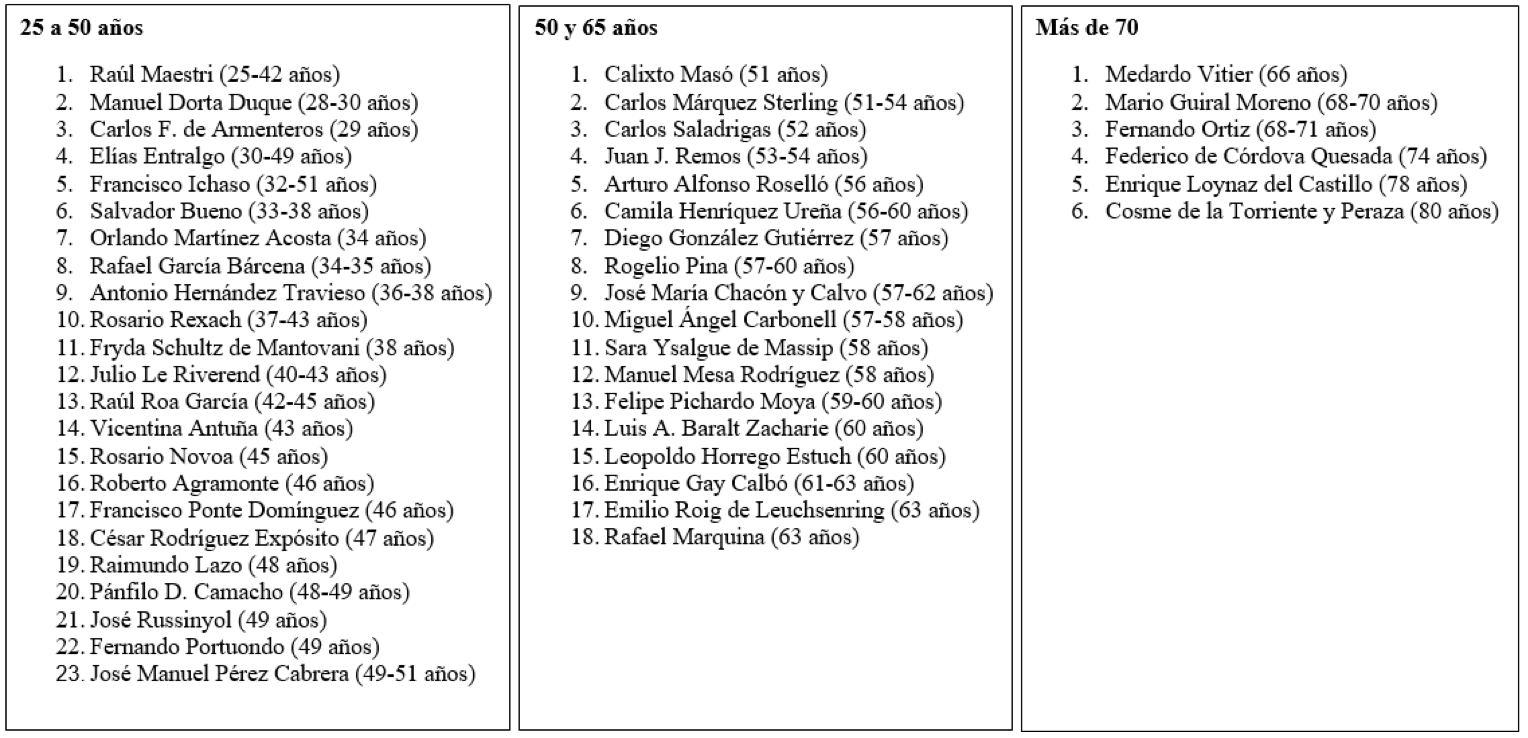 Cabe señalar que a Mañach, Félix Lizaso (1891-1967) y Emeterio Santovenia (1889-1968) ha sido difícil ubicarlos en uno de estos grupos, pues sobrepasan los límites etarios antes señalados. Si se tiene en cuenta la fecha en que estos dictaron sus conferencias sobre historia de Cuba –tal y como se ha planteado–, Mañach se encuentra en un rango de 34 a 54 años, Lizaso en uno de 42 a 61, y Santovenia en uno de 44 a 63. Esto se debe –fundamentalmente– a la larga trayectoria de estos en la Universidad del Aire, siendo de los pocos que impartieron conferencias en las dos etapas del programa.