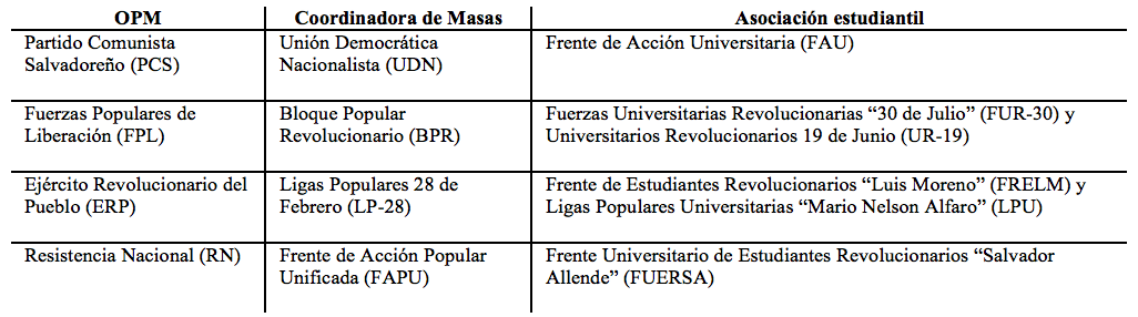A lo interno de la UES, esta década fue testigo de la vinculación de los bloques estudiantiles con las coordinadoras de masas de las Organizaciones Político-Militares (OPM)10. Estas coordinadoras buscaban posicionar a miembros de las OPM dentro de las organizaciones populares, articular y orientar la lucha social y crear un respaldo para apoyar una posible insurrección de masas (Martín, 2010).