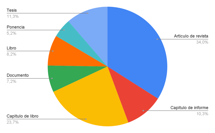 El análisis del tipo de publicaciones que se han hecho evidencia una preeminencia de los artículos publicados en revistas académicas (Gráfico 1). De los 97 textos ubicados, 33 responden a este formato de circulación, seguido de 23 capítulos de libros dedicados a profundizar en esta temática. En tercer lugar, se encuentran 10 textos que forman parte de diferentes informes. Como se observa, estos tres formatos suman el 68 % del total de todas las publicaciones que se han hecho sobre la temática.