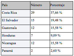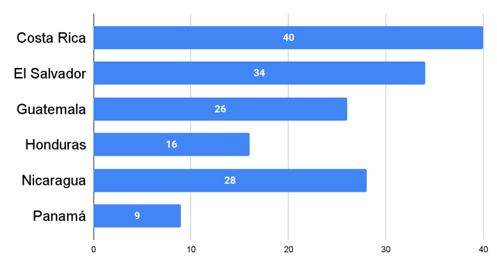 La sistematización brinda otros datos relevantes. Muy cerca de Costa Rica, se encuentra El Salvador, presente en 34 de las 97 publicaciones recopiladas. Los datos de Nicaragua, Guatemala y Honduras, por su parte, aparecen en 28, 26 y 16, respectivamente, de los textos sistematizados. Panamá es el país menos aparece dentro de la muestra construida, con solo 10 trabajos que le mencionan.
