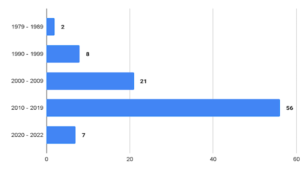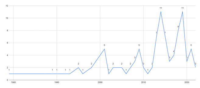 Agrupar los trabajos por décadas evidencia el renovado interés que ha suscitado este tema en la academia centroamericana en las últimas dos décadas (Gráfico 5). Entre 1979 y 1999 solo fue posible ubicar 10 trabajos, mientras que durante el primer cuarto de este siglo se han producido como mínimo unos 84 textos. Es decir, el 86 % de las investigaciones ubicadas fueron generadas después del año 2000.