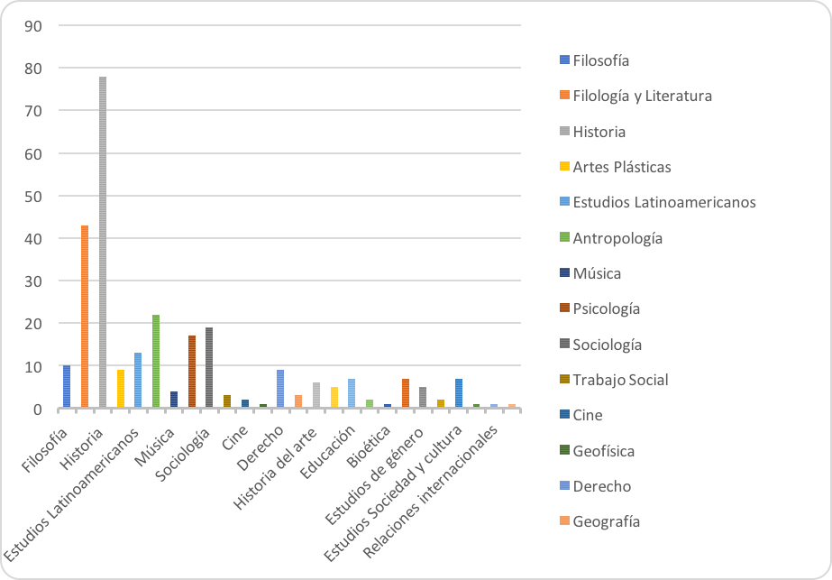 Asimismo, si se pone atención al área del conocimiento desde la cual se realiza el estudio, encontramos que, si bien los enfoques propios de los estudios latinoamericanos, la historia, la antropología y la sociología prevalecen entre las áreas disciplinarias desde las cuales se aborda la mayoría de los artículos publicados en los distintos números. También es cierto que la cobertura y las miradas han sido diversas, lo cual le otorga a este proyecto editorial una gran riqueza teórica y metodológica ya que, en muchos casos, los abordajes y las interpretaciones en torno a problemas específicos y situaciones concretas son realizados desde distintas perspectivas. En el Gráfico 1 se visibiliza esta amplitud disciplinaria alcanzada hasta el momento.