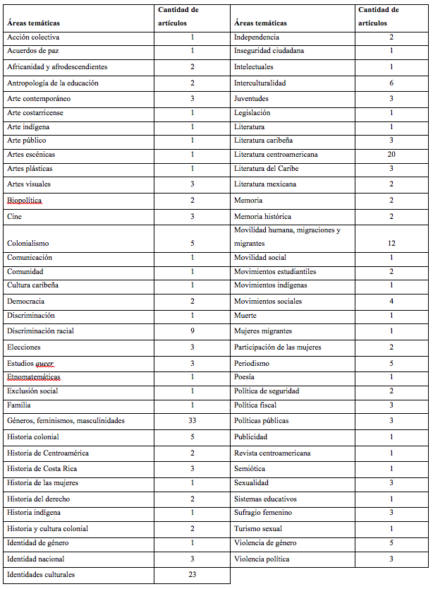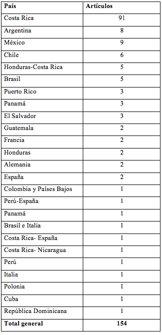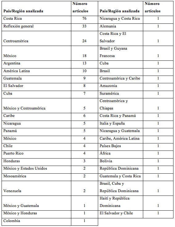 Si se pone atención al país o área geográfica analizada en los distintos artículos, sobresalen aquellos que se concentran en el estudio de Costa Rica como sociedad y como Estado, y también algunos artículos que abordan temáticas generales y que en su mayoría son reflexiones teóricas o metodológicas sobre aspectos necesarios para el estudio de temas y problemas específicos. Pero también se puede observar cierta concentración numérica en estudios que tratan sobre el área centroamericana en su conjunto y esta cuenta va en descenso cuando se trata de artículos que analizan situaciones relacionadas con un país centroamericano en particular y, en el caso del Caribe las referencias decrecen aún más.