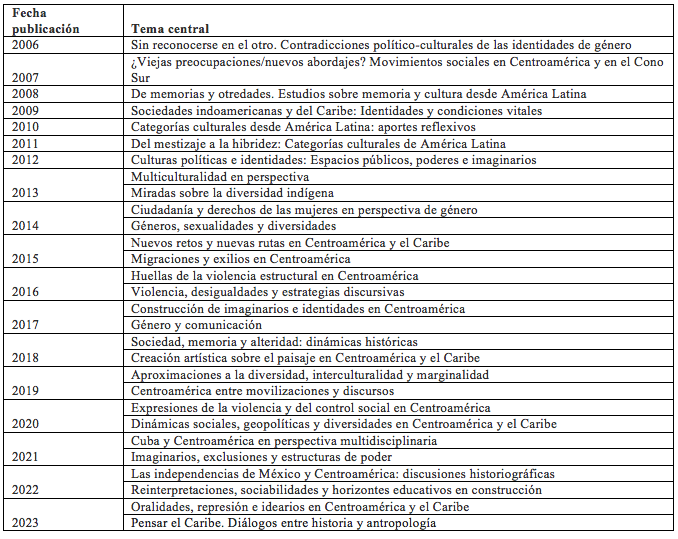 Complementando lo anterior, en el Cuadro 3 se muestra tanto la gran diversidad de temáticas abordadas en los distintos volúmenes, así como la recurrencia de algunos temas, entre los que destacan los relacionados con los géneros, los feminismos y las masculinidades, al igual que las identidades culturales, la literatura centroamericana y también la movilidad de la población, las migraciones y la violencia en sus diferentes formas y expresiones; que a su vez muestran las preocupaciones sociales y los dilemas académicos que están siempre presentes y que constituyen una constante en la región. Un conjunto de contradicciones que, en toda su complejidad, han sido abordados desde distintas perspectivas disciplinarias.
