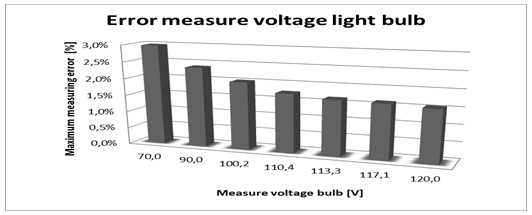 Figure 4 shows the voltage data with a maximum error of 3% at 70V and a minimum error of 1.6% for values higher than 113.3V, which indicates that the error decreases with higher voltage values.