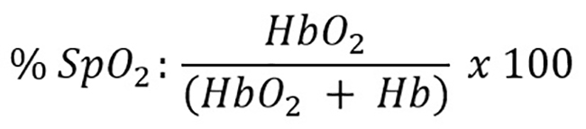 Pulse oximetry distinguishes two types of hemoglobin: One carrying oxygen called oxyhemoglobin (HbO2) and the reduced hemoglobin (Hb). As the two types are different kinds of substances, both absorb light at different light wavelengths, giving the pulse oximeter the ability to measure the proportions of HbO2 and Hb in blood flow by using two different light sources and different wavelengths [16]. The result of pulse oximetry is the estimation of oxygen saturation (SpO2) defined as the proportion of oxyhemoglobin (HbO2) in the total hemoglobin measured (Hb + HbO2) as shown in equation 2: