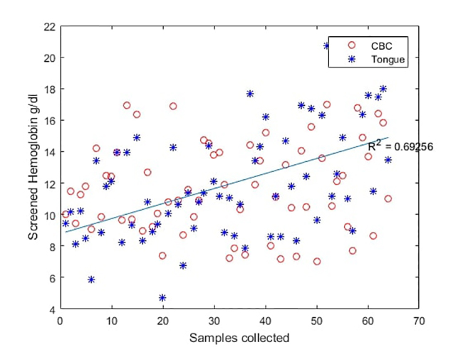 The proposed model compares well to an ordinary hemogram under standardized image capture conditions resulting in it being 91.89 % sensitive (34/37) and 85.18 % specific (23/27) for tongue analysis and 91.89 % sensitive (34/37) and 70.34 % specific (19/27) for conjunctiva, which shows that tongue analysis under standardized controlled conditions offers better results than does conjunctiva analysis. However, the attained regression adjustment is 0.69 and 0.57, respectively; this is a very good result compared to a traditional invasive test in resource shortage situations and is supportive of previous findings of low association rates between the conjunctiva and invasive testing.