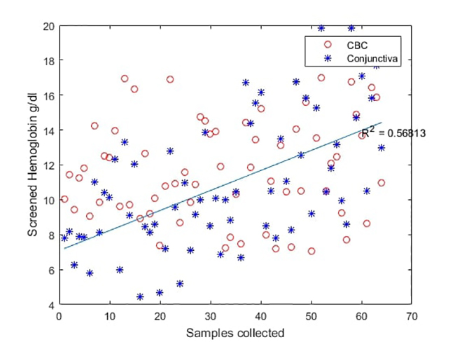 1. Select a sample of at least 15 to 30 individuals. Perform an invasive hemoglobin lab test using the complete blood cell count (CBC). For this study, lab results from 34 individuals were used to perform the curve fitting. Rejection criteria for this group were the presence of conjunctivitis, skin trauma or jaundice. Additionally, pregnant applicants were not considered [26].