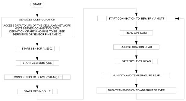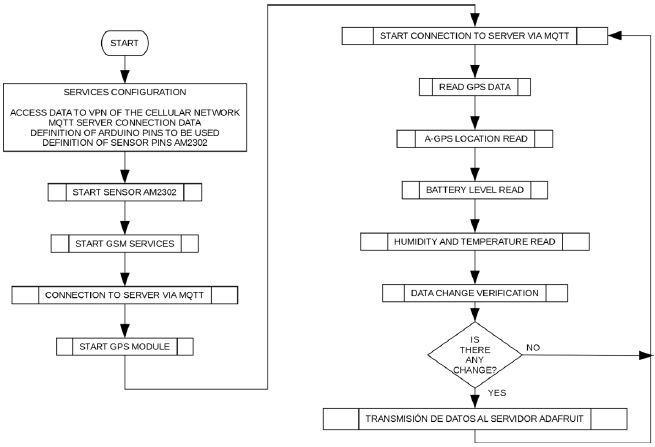 In the algorithm described above, we can identify the initialization of the AM2302 sensor; then, it starts the negotiation procedure with the GSM network through the use of the data entered in the APN section. Once this stage is successful, the GPS module initializes. To begin the synchronization, at this point, the main loop that reads the AM2302 sensor is initiated and requests the location information from the GPS module to send the data to the test website of the manufacturer Adafruit through the use of the MQTT protocol, which proceeds with the data entered in the server section.