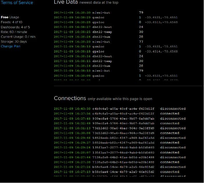For these tests, it was decided to opt for the website provided by the Adafruit IO. Adafruit, rather than larger platforms, was chosen mainly because they require advanced computing knowledge, and for extensive use of the modules, payment must be made. The Adafruit IO allowed us, in its free version, to save the data for one month and has different display options that include real-time graphics and incorporates maps that show the geolocation information, allowing us to track the displacement of the module, in addition to having clear literature for any user.