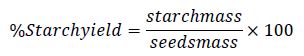 Starch was characterized by the contents of moisture [20], gelatinization temperature for the Grace method [21], water absorption rate, water solubility, swelling power [22], starch [23], amylose, amylopectin [24] and pasta clarity [25]. In addition, the starch yield was determined through the relationship between the starch masses obtained and the avocado seeds used according to equation (1).
