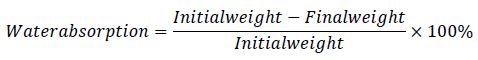 The moisture was determined by gravimetry according to method AOC 934,06 [27], for which 0,50 g of film was weighed and dried at 100 °C for 4 h until constant weight. For water absorption, 0,50 m ± 0,001 m specimens were made and dried at 50 °C for 24 h. They were cooled to room temperature and weighed. They were then introduced into 400 mL of distilled water for 24 h. After this time they dried and weighed [28]. The percentage of water absorption was calculated with the equation (2).