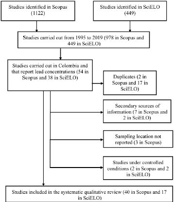 Three inclusion criteria were defined as follows: 1) the studies were carried out in the period between 1995 and 2019 were included, that is, starting from the year in which regulations eliminated lead in gasoline [19]; 2) the samples of the environmental matrix under investigation were located in Colombia, since some authors mentioned the country, but used samples from other places and therefore their results were not of interest for this study; and 3) the results reported quantitatively the lead concentrations determined, in such a way that they could be compared with reference values.